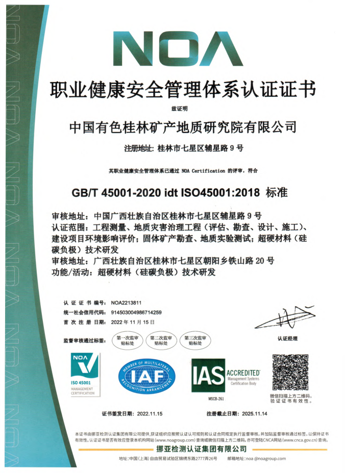 為順利通過(guò)認(rèn)可獲得專業(yè)證書(shū),中色桂林院高度重視,自2022年全面啟動(dòng)認(rèn)證工作以來(lái),主要領(lǐng)導(dǎo)的高位推動(dòng),相關(guān)部門密切協(xié)作,陸續(xù)順利完成了管理手冊(cè)、程序文件的編制,內(nèi)部審核、管理評(píng)審制度匯編,環(huán)境因素、危險(xiǎn)源及法律法規(guī)識(shí)別,文件制度、記錄梳理評(píng)審,安全、環(huán)境合規(guī)性評(píng)價(jià)以及三大規(guī)程完善等工作。11月15日,上海挪亞檢測(cè)認(rèn)證集團(tuán)有限公司為中色桂林院簽發(fā)了ISO14001及ISO45001體系認(rèn)證證書(shū),正式通過(guò)環(huán)境管理、管理體系認(rèn)證。