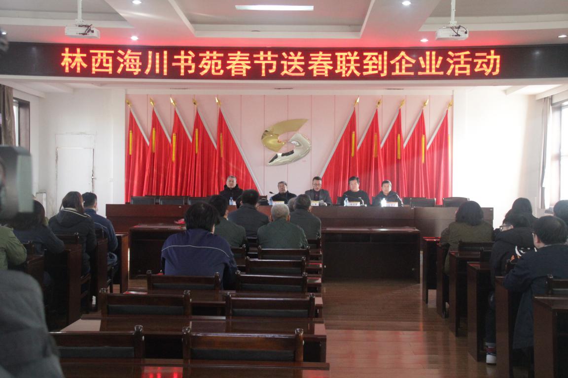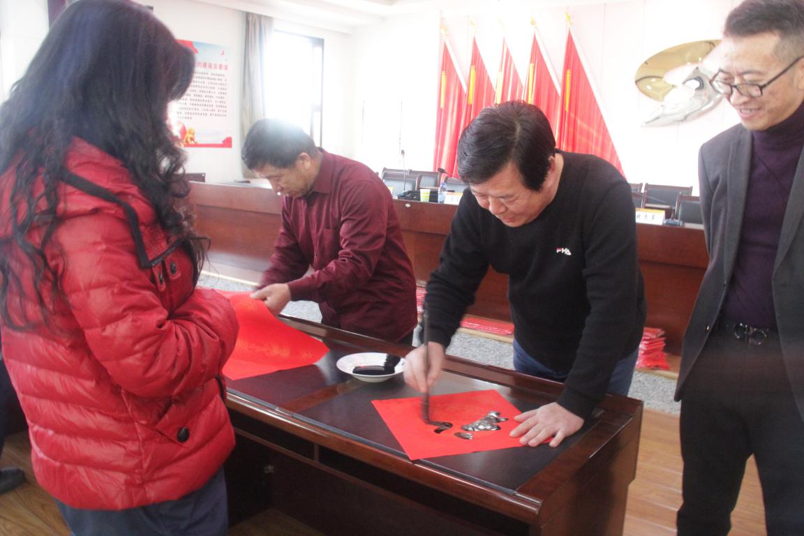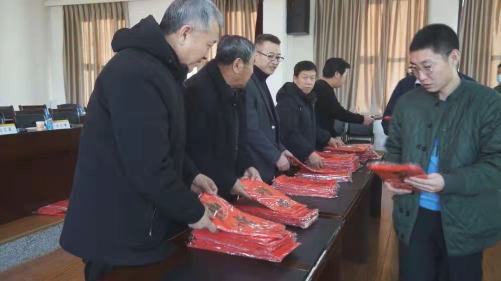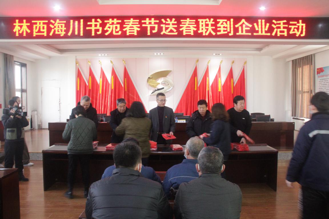 海川書畫院的任宗敏院長、副院長姚杰軍、顧問張玉生、院士王明岐為職工們送上帶來的400余幅春聯。