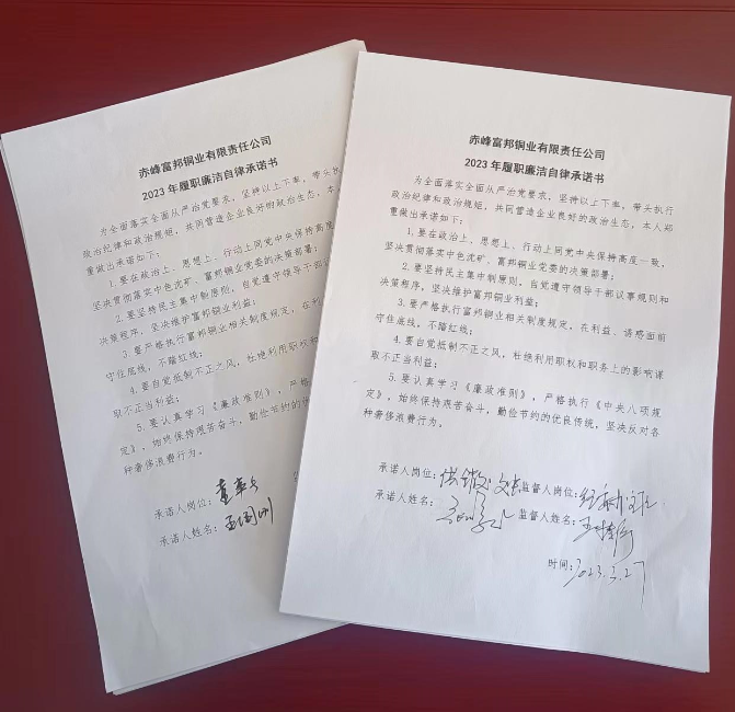 2023年3月,為進一步落實中色沈礦2023年黨風廉政建設和反腐敗工作會議精神,富邦銅業新一屆領導班子帶頭,并組織公司全體中層干部分別簽訂了《赤峰富邦銅業有限責任公司2023年廉潔自律承諾書》。廉潔承諾書從以下5個方面做出承諾: